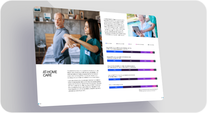 Ongoing caregiver shortages, an aging population that prefers to remain at home, and the growing presence of chronic diseases globally will drive the need for at-home care technologies such as RPM. Patients indicate they are comfortable with these in-home treatment models—58 percent of global patients indicated at least minimal comfort with RPM (see Figure 14), which is very likely to grow—market research firm Research and Markets projects the global remote patient market will be worth more than US$1.7 billion by 2027. Very comfortable Somewhat comfortable Neutral Somewhat uncomfortable Very uncomfortable Using a SMART DEVICE that will collect their data in real time, which is then stored in an app and sent to the HCP Using a SMART DEVICE to monitor their healthcare needs in real time in between HCP visits Using a VIRTUAL ASSISTANT to monitor their healthcare needs in real time in between HCP visits, as well as advise on a treatment plan The pandemic has brought the necessity of at-home care to the fore. AT-HOME Naturally, home has become a healthcare setting for patients—from CARE health and wellness to healthcare engagement via virtual visits and remote patient monitoring (RPM), consumers are embracing new Using a SMART DEVICE to aid in your treatment and/or recovery technologies that can enable their continued course of care at home. from an injury, illness, or disease In particular, at-home testing has now gone mainstream, as diagnostic COVID-19 tests have been distributed for free across several countries— including the US with an announcement by the government in December 2021 that it would offer 500 million free at-home COVID-19 tests in an Using an at-home diagnostic test 6 effort to combat the Omicron variant of the virus . The demand for at- home diagnostics will continue to accelerate, a trend that was already well underway before the pandemic. Figure 14. Patient Comfort Level for Using At-Home Diagnostics and RPM. An indication of the degree to which global patients are comfortable using certain emerging healthcare technologies. 22 23