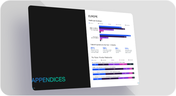 EUROPE Healthcare Sentiment Strongly agree Somewhat agree Neutral Somewhat disagree Strongly disagree Believe the healthcare system where they live could be improved Have access to adequate healthcare Patient Experience in the Past 12 Months 21% 19% 9% 11% Were unable OR had Were unable to schedule Did not receive Were unable to reach a delay in scheduling a timely in-person visit a call-back from their HCP for health- a medical procedure with their HCP their HCP related concerns The Patient-Provider Relationship Strongly agree Somewhat agree Neutral Somewhat disagree Strongly disagree Are concerned about their medical information being hacked or shared without their knowledge Would find a new healthcare provider if they had a bad experience Trust the HCPs in their network make the best decisions regarding their health Are satisfied with the level of service and attention they receive from their HCP 32 33