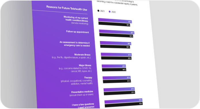 ASTOUNDCOMMERCE.COM ASTOUND HEALTH REPORT 2023 A growing percentage of respondents reported that Among the 51 percent who would engage in they would be likely to use telehealth for remote telehealth for therapy, more than two-thirds (68 monitoring and follow-up appointments in 2022, and percent) of respondents would be likely to use comfort levels remained stable across most other types telehealth for counseling, while mental health and + of medical appointments as compared to 2021— addiction support also received substantial year-over- suggesting that the adoption of the technology is year gains, perhaps reflecting a general increase in becoming a habit for a substantial majority of patients. social acceptance of mental and behavioral health issues. Consumers show less appetite for therapies like physical and occupational health that require a 51% Reasons for Future Telehealth Use 2021 2022 greater degree of physical guidance and interaction— at least until new virtual tools become more wildly of respondents would be likely 4 developed and embraced for patient rehabilitation. to use telehealth for therapy Monitoring of my current 63% health condition/illness 59% (remote monitoring) Follow-up appointment 66% 63% Reasons for Considering Telehealth Therapy 2021 2022 An assessment to determine if 58% emergency care is needed 56% Moderate illness 57% Mental health 47% (e.g., the flu, digestive issues, a sprain, etc.) 56% 36% Major illness 44% (e.g., concerns related to COVID-19, 44% Addiction 20% cancer, MS, lupus, etc.) 16% Therapy 51% (physical, occupational, counseling, 51% Counseling 68% addiction, mental health) (help in understanding underlying physiological & psychological issues) 55% Preventative medicine 57% (annual check-up or exam) 57% Physical 34% 35% I have a few questions 70% I need answered 70% Occupational 39% (meaningful activities designed to help you 45% Minor illness 63% adjust your environment to your needs) (e.g., a cold, an earache, strep throat, etc.) 64% An initial consultation 63% 64% Figure 11: Year-over-year comparison of percentage of respondents who Figure 12: Year-over-year comparison of respondents who would consider using telehealth for therapy by type, among those who would be likely to engage in telehealth for each reason. would be likely to use telehealth for therapy at all. 18 19