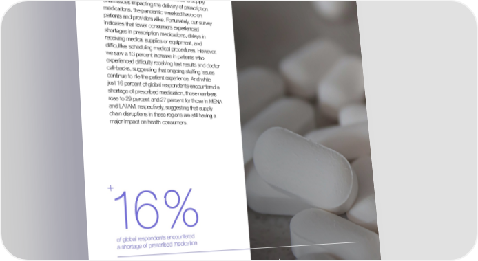 ASTOUNDCOMMERCE.COM ASTOUND HEALTH REPORT 2023 + Pain Points & Disruptions Healthcare Disruptions 2021 2022 From delays in non-urgent procedures to supply A shortage of prescribed medication 17% 16% chain issues impacting the delivery of prescription medications, the pandemic wreaked havoc on patients and providers alike. Fortunately, our survey indicates that fewer consumers experienced shortages in prescription medications, delays in A delay in receiving medical receiving medical supplies or equipment, and equipment or medical supplies 17% 13% difficulties scheduling medical procedures. However, we saw a 13 percent increase in patients who experienced difficulty receiving test results and doctor call-backs, suggesting that ongoing staffing issues continue to rile the patient experience. And while Inability or a delay in scheduling 21% 18% just 16 percent of global respondents encountered a a medical procedure shortage of prescribed medication, those numbers rose to 29 percent and 27 percent for those in MENA and LATAM, respectively, suggesting that supply chain disruptions in these regions are still having a major impact on health consumers. Unable to schedule a timely in-person 26% 24% appointment with your physician Inability to reach your healthcare provider for health-related 15% 15% + questions/concerns Did not receive the results of a diagnostic test (e.g., heart scan, X-ray, 6% 9% 16% etc.) OR the results were delayed of global respondents encountered a shortage of prescribed medication Did not receive a call-back from 13% 16% + your healthcare provider The worst disruptions have eased, but pandemic strain on the healthcare system is still impacting Did not experience any of these 40% 48% the patient experience Figure 24: Year-over-year comparison of global respondents who reported experiencing each disruption in 2022 and 2021. 32 33