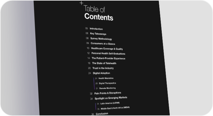 + Table of Contents 05 Introduction 06 Key Takeaways 08 Survey Methodology 09 Consumers at a Glance 10 Healthcare Coverage & Quality 12 Personal Health Self-Evaluations 14 The Patient-Provider Experience 16 The State of Telehealth 20 Trust in the Industry 24 Digital Adoption 24 Health Wearables 28 Digital Therapeutics 31 Remote Monitoring 32 Pain Points & Disruptions 34 Spotlight on Emerging Markets 34 Latin America (LATAM) 35 Middle East & North Africa (MENA) 36 Conclusion 37 References