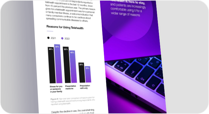 ASTOUNDCOMMERCE.COM ASTOUND HEALTH REPORT 2023 + The State of Telehealth As pandemic restrictions eased, our survey showed +Telehealth is here to stay, ed an overall decline in the use of telehealth compar and patients are increasingly to 2021: only 36 percent of respondents reported a telehealth appointment in the last 12 months, down comfortable using it for a from 45 percent the previous year. The primary reason wider range of reasons given for a telehealth appointment was for a personal or family member illness, a welcome indication that many consumers continue to be cautious about spreading communicable diseases to others. Reasons for Using Telehealth 2021 2022 53% 50% 49% 45% Key Factors for Telehealth Care 2021 RANK 2022 RANK 28% 23% A healthcare provider who takes the time to listen to my issues/concerns and 1 1 shows empathy and understanding Illness for you Preventative Prescription A healthcare provider who clearly explains or someone medicine refill only what they are doing during the exam/meeting in your family and provides follow-up information 3 2 Figure 9: Year-over-year comparison of reasons given for having a telehealth appointment among respondents who reported using telehealth. A virtual visit that’s high quality (i.e., stable Wi-Fi, clear camera, 2 3 Despite the decline in use, the overwhelming adequate sound, in a quiet setting) majority (85 percent) were satisfied with their telehealth experience. Although the top four priorities for a virtual health visit remained the The ability to have all my concerns met same as the previous year (a provider who listens including medications prescribed and/or 4 4 to concerns and shows empathy, a provider who next medical steps scheduled clearly explains information, the ability to have all concerns met, and a high-quality virtual visit), a high-quality virtual visit dropped from the second- most-important factor in 2021 to the third in 2022, perhaps indicating that the technology supporting these visits is doing a better job meeting needs and is no longer at the forefront of consumer concerns. Figure 10: Year-over-year comparison of global consumer ranking of the importance of each factor for a telehealth appointment. 16 17