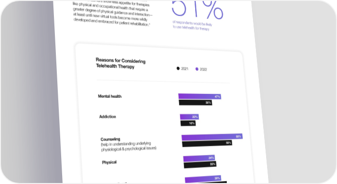 ASTOUNDCOMMERCE.COM ASTOUND HEALTH REPORT 2023 A growing percentage of respondents reported that Among the 51 percent who would engage in they would be likely to use telehealth for remote telehealth for therapy, more than two-thirds (68 monitoring and follow-up appointments in 2022, and percent) of respondents would be likely to use comfort levels remained stable across most other types telehealth for counseling, while mental health and + of medical appointments as compared to 2021—addiction support also received substantial year-over- suggesting that the adoption of the technology is year gains, perhaps reflecting a general increase in becoming a habit for a substantial majority of patients. social acceptance of mental and behavioral health issues. Consumers show less appetite for therapies like physical and occupational health that require a 51% Reasons for Future Telehealth Use20212022greater degree of physical guidance and interaction— at least until new virtual tools become more wildly of respondents would be likely developed and embraced for patient rehabilitation.4 to use telehealth for therapy Monitoring of my current 63% health condition/illness 59% (remote monitoring) Follow-up appointment66% 63% Reasons for Considering Telehealth Therapy 2021 2022 An assessment to determine if 58% emergency care is needed56% Moderate illness 57% Mental health 47% (e.g., the flu, digestive issues, a sprain, etc.)56% 36% Major illness 44% (e.g., concerns related to COVID-19, 44%Addiction 20% cancer, MS, lupus, etc.) 16% Therapy 51% (physical, occupational, counseling, 51%Counseling 68% addiction, mental health)(help in understanding underlying physiological & psychological issues) 55% Preventative medicine 57% (annual check-up or exam)57%Physical 34% 35% I have a few questions 70% I need answered70% Occupational 39% (meaningful activities designed to help you 45% Minor illness 63% adjust your environment to your needs) (e.g., a cold, an earache, strep throat, etc.)64% An initial consultation63% 64% Figure 11: Year-over-year comparison of percentage of respondents who Figure 12: Year-over-year comparison of respondents who would consider using telehealth for therapy by type, among those who would be likely to engage in telehealth for each reason.would be likely to use telehealth for therapy at all. 18 19