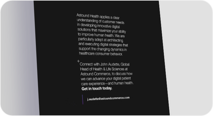 Astound Health applies a clear understanding of customer needs in developing innovative digital solutions that maximize your ability to improve human health. We are particularly adept at architecting and executing digital strategies that support the changing dynamics in healthcare consumer behavior. + Connect with John Audette, Global Head of Health & Life Sciences at Astound Commerce, to discuss how we can advance your digital patient care experience—and human health. Get in touch today. j.audette@astoundcommerce.com